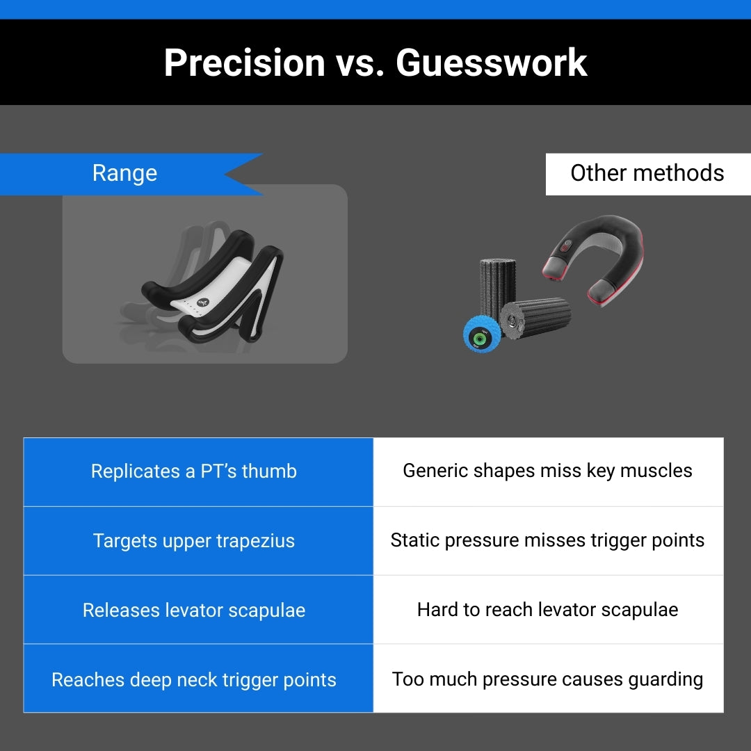 The upper trapezius, suboccipitals, and pectoralis minor are the three muscles most responsible for tension headaches, neck stiffness, and shoulder strain. When these muscles stay tight, relief from massage, stretching, and heat remains temporary. The Range gives you clinical-depth access to all three, at home, on your schedule.